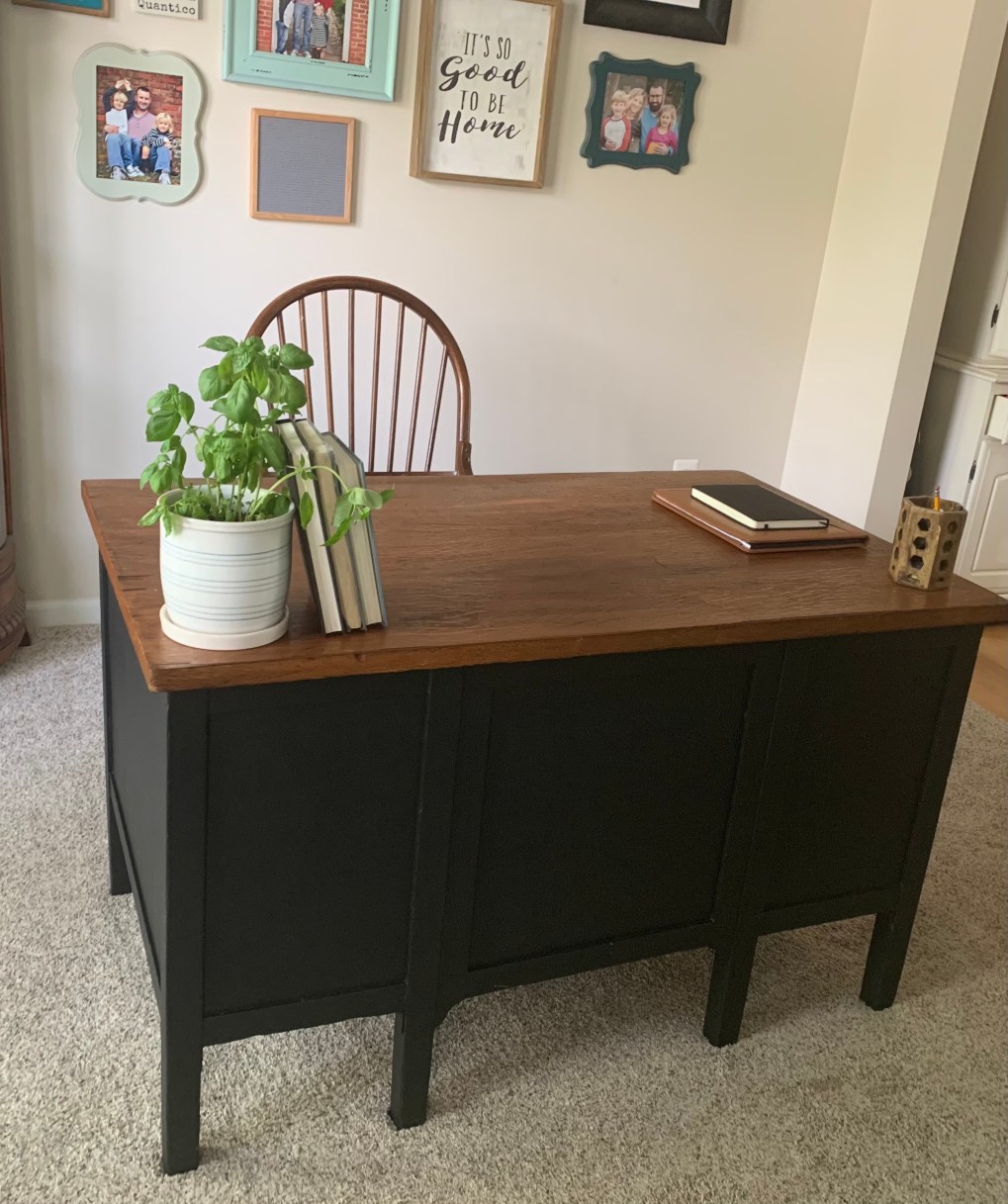 I don’t know about yall, but I am finding myself gravitating towards simplicity and the less is more mentality. Maybe it’s age, maybe it’s spring, but having the minimal things in my space just feels clean, fresh and organized. I am loving this desk refresh. We have always loved this desk because it is solid wood and has many storage capabilities, but was yearning for a more modern classic look. I hated to paint it, because I also love natural wood pieces lately as well, but am so glad I took the plunge. This desk revamp gave our office a modern, yet classic touch. It feels updated, clean and we are obsessed. We can’t wait to turn this cluttered office space into something a little less busy, and more simple. I hope y’all enjoyed this project, and are encouraged to make your space beautiful, and a little more simple.
