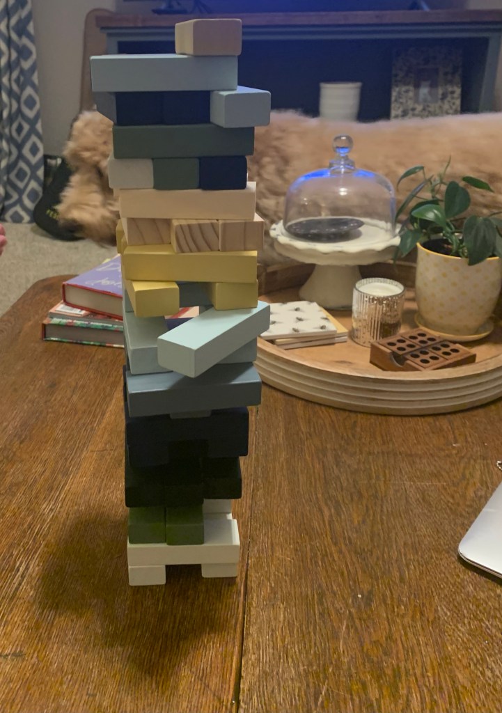 I hope that these pretty little building blocks remind my family to enjoy the little things that help us connect. My thought is that instead of having these stored in the basement & we will forget about them but having these building blocks on display not only because well they are pretty, but we will be reminded to connect. I hope that my daughter will always say “hey mom game of Jenga?” & My son will always try to do the craziest move first. I hope the laughter of my family connecting always fills our home. I hope that they are subtle reminder of the good times, the times, we loved and laughed.