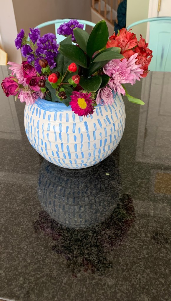 Have you heard of The Lazy Daisy? I have walked into this store dozens of times. It’s my favorite little local treasure hunt and escape. A stroll through the daisy with my favorite latte in hand jamming to all the best country tunes is a sure day maker. True story the original Lazy Daisy store started in Chester, VA in my husband’s grandfather’s old pharmacy. How cool is that! As I wondered through the store this past week, I stopped in front of this jar. Every time I have gone into the daisy something about this crazy looking jar pulled me in, but each time I put it back. The jar wasn’t the prettiest, but I saw its potential, but what could I do with it? I couldn’t quite nail down a use for it. This past week I saw that same old jar and it hit me… a vase. I pretty much always have fresh flowers on the counter. It’s my weekly grocery store treat to myself. If you don’t do this, I encourage you to start this week, I promise it will brighten up your week. I googled how to paint ceramic. There are lots of recommendations on how to do this. I wanted minimal work and supplies. Its certainly not perfect, but I didn’t want it that way, it has character. I’m proud of it and can’t wait to do more projects like this in the future. I hope you all enjoy this quick easy DIY project and I hope it inspires you to buy yourself the flowers, and maybe turn that old jar into something pretty.